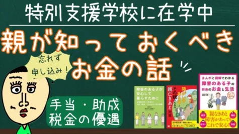 その他コラム・質問集手当・助成・税金の優遇は申し込んだ?【特別支援学校の親むけ】 障害のある子どもには「お金をたくさんのこせば安心」ではない。むしろ毎日のお金をどう管理するのかが大切。それを知った上で、毎日のお金を少しでも余裕のあるものにするための、①手当(もらえるお金)②助成(必要なお金のサポート)③税金の優遇(安くなる・免除)を解説しました。 2024.12.10その他コラム・質問集卒業後の話題