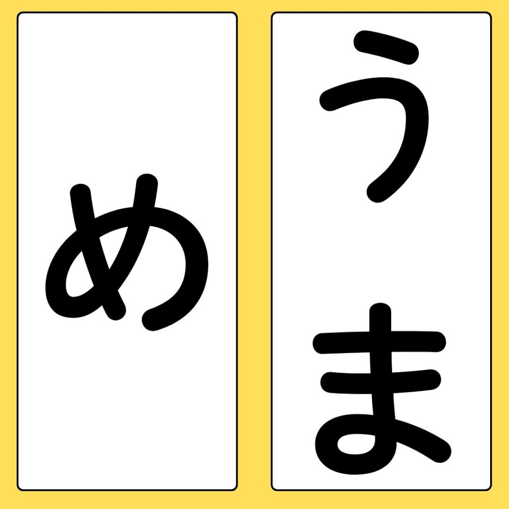 下の絵カードとひらがなの文字カードを子どもの前に並べて、「これはなに?」って聞くんやで。