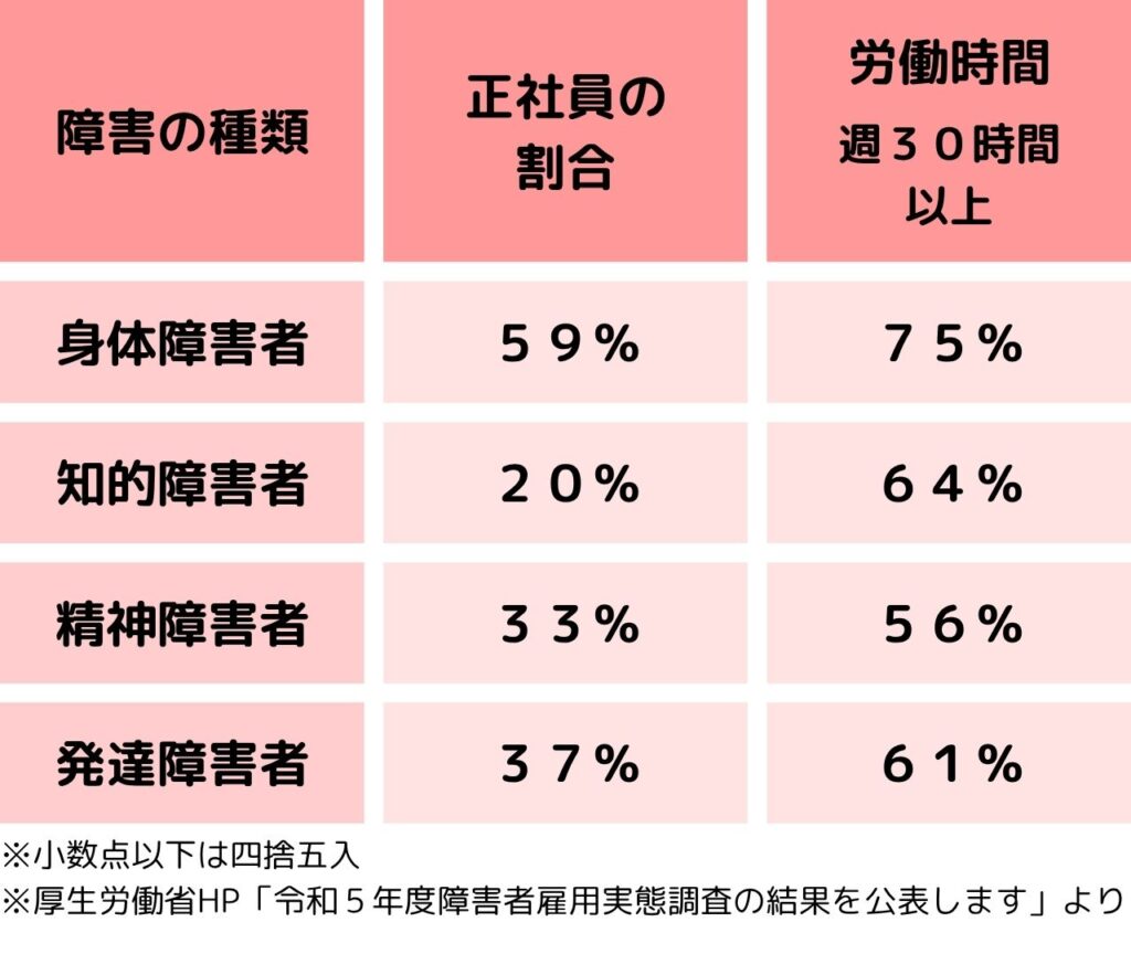 一番給料が多い身体障害者は正社員の割合が多くて、労働時間も長いで。